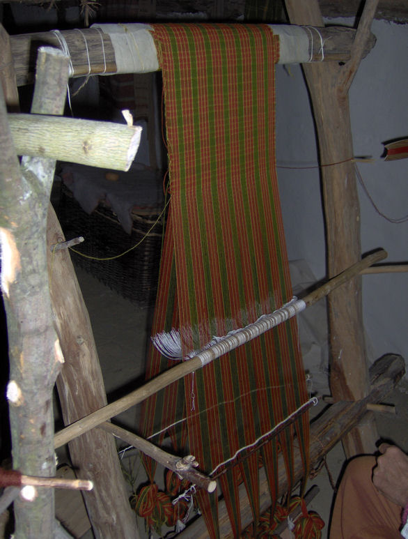 Each layer of warp threads is divided into bunches to which loom weights are tied, to hold the threads under tension. The even set of threads is tied to a rod which is known as the heddle rod (G). Each even warp thread is tied to this rod with a loop called the heddle (H) which is passed between two odd warp threads. The heddle rod sits on supports on which it can have two positions. The first position creates the natural shed. The thread that is being used to weave, called the weft or woof thread, can be passed between the two sets of warp threads, through this shed. In the second position the heddle rod is lifted forward to bring the even set of warp threads in front of the odd set of threads. This creates a different shed called the counter-shed (2). The weft thread is then passed back through this shed. This process of passing the weft thread through the shed, in a direction and in the opposite is repeated until cloth is finished.