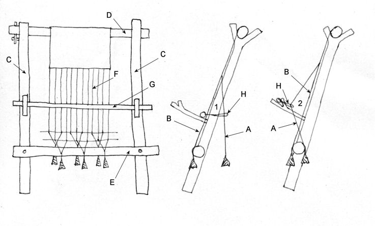 The warp-weighted loom is constructed of two upright beams (C) connected at the top by a bar called the cloth bar (D) on which the cloth can be wrapped. From the cloth bar are hung the warp threads (F) which run vertically. The warp threads are divided into two groups for a simple weave (plain weave, also called Tabby Weave): even and odd threads. A beam parallel to the cloth beam called the shed rod (E) helps to separate evens and odd threads. The even warp (A) threads will hang perpendicular to the ground, vertically behind the shed rod and make an angle with the upright beam because the loom leans against a wall. The odd warp threads (B) are placed in front of the shed rod, and are parallel to the upright beams. The open space between the two sets of warp threads is called the natural shed (1).