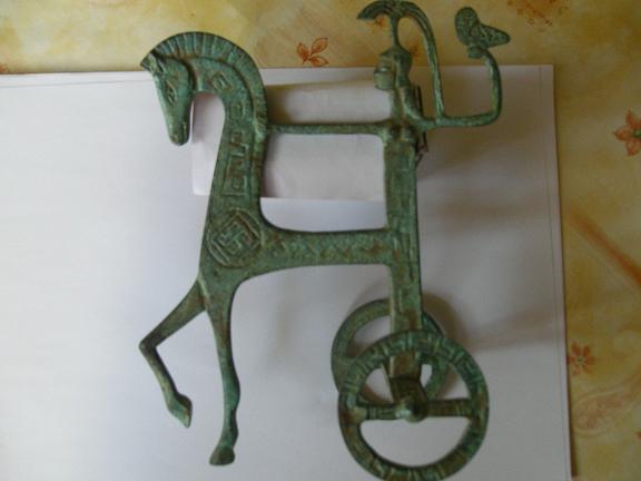 En attendant d'y parvenir donc elle est en métal cuivre verdi 20 cm de haut pa 15, le bras doit tient la crinière du cheval, c'est très stylisé. C'est un char à deux roue,