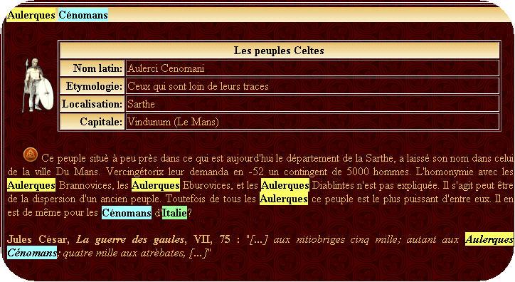 je ne voudrais pas rentrer dans un débat houleux mais la page sur laquelle il était question des Aulerques Cénomans d'Italie ....vient d'être changée.... il manque maintenant une phrase [la dernière] < dû à une rectification soudaine http://www.arbre-celtique.com/encyclope ... ns-378.htm * je vous assure, je ne prends pas de médicament ![]() Allez, va... Jacte à l'Est