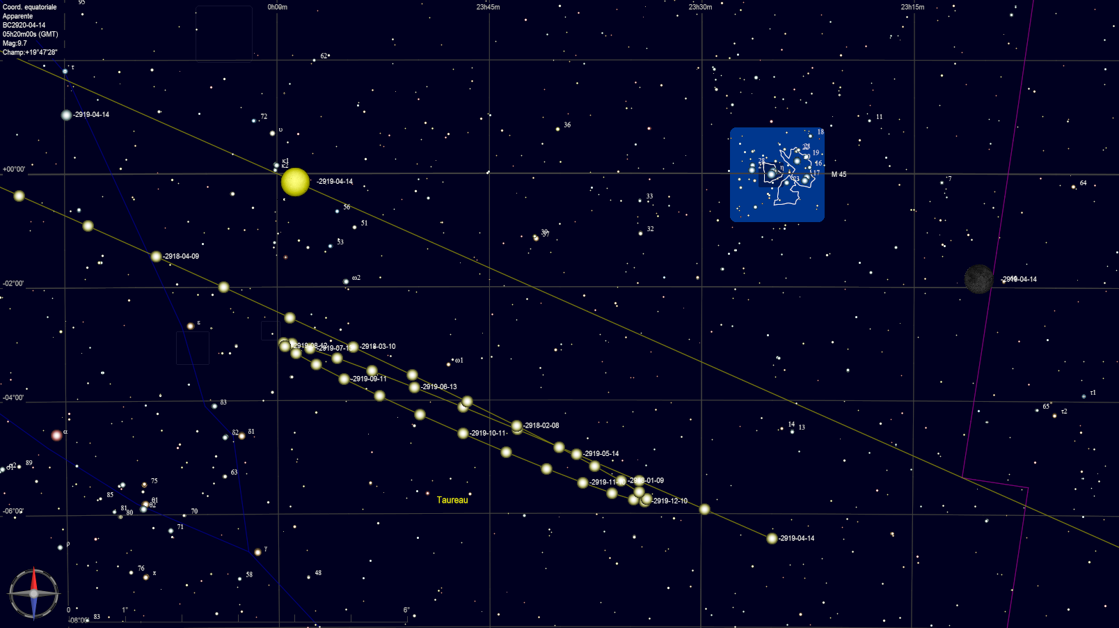 A l'aide du logiciel Skychart, j'ai donc recherché la période avant -3000 où l'on peut considérer que les Pléiades étaient sur l'équateur céleste compte tenu de l'effet de la précession. Elles sont petites mais étendues donc je me suis arrêté au moment où l'équateur céleste passe par le milieu de l'amas soit vers l'an -2920. On peut considérer que M45 traverse l'équateur céleste de l'an -3000 à l'an -2870 soit sur environ une période de 130 ans comme solution possible à notre problème.