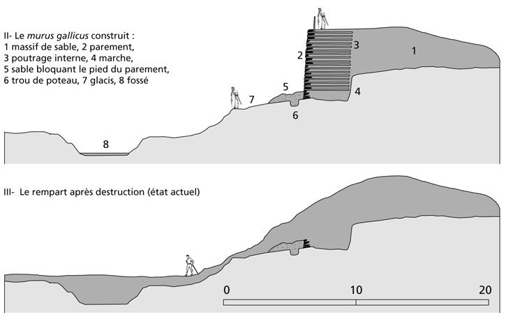 Le rempart type Fécamp ou à talus massif me parlait plus qu' une levée de terre. Une levée de terre pouvait être aussi bien pour moi les restes d'un rempart type murus gallicus comme le montre ce schéma. Sources: http://racf.revues.org/515 et http://racf.revues.org/632