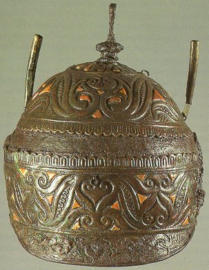 Le casque est la seule arme défensive vraiment portée par les Celtes. Le plus souvent, il est fait en bronze. Certains cependant échappent à la règle et sont en fer. Par la suite il est surmonté d'une pointe plus ou moins haute. A l'arrière du casque se trouve un couvre-nuque. Sur les côtés, on trouve parfois des pièces en métal servant à protéger les joues (paragnathids?). Les casques aussi sont ornés de magnifiques décorations. Les plus beaux d'entre euxs sont probablement réservés à une élite guerrière. Les cornes représentent la férocité et la virilité. Par la suite, la forme des casques se modifie. Ils deviennent moins hauts, moins élancés, aboutissant parfois à de simples calottes hémisphériques en fer ou en bronze. A côté de tous ces casques métalliques, il existe sans doute des calottes en cuir qui, avec le temps disparaîtront. |
