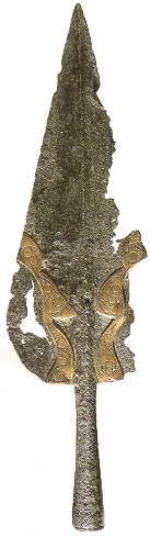 L'épée est en fer car les Celtes manient très bien cette matière. De ce fait, elle est d'une qualité irréprochable et crainte par de nombreux peuples en même temps qu'admirée. Elle est davantage conçue pour trancher que pour porter des coups. Ces épées sont imitées et exportées en Corse et dans certains peuples italiques. La soie est séparée de la lame par une petite pièce indépendante en fer. Cette lame est généralement simple, contrairement à la poignet et au fourreau qui possèdent de nombreuses décorations, en particulier des symboles astraux. Le plus souvent, la poignée est en matière périssable. D'après les nombreuses fouilles et les oeuvres des auteurs antiques, on sait maintenant que le guerrier celte porte l'épée dans son fourreau sur son côté droit. Cependant, il peut aussi la porter à hauteur d'épaule si celle-ci est longue. |