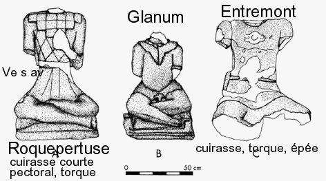 Image 1 : a) armure linothorax grec (4e siècle av J.C.) b) armure représenté sur un bronze romain exposé au musée du Vatican (pour l'avoir vu en vrai si mes souvenirs sont exacts) c) armure de fer de la tombe de Philippe 2 de Macédoine (4e siècle av J.C.) d) personnage du fourreau de fer et de bronze de la tombe 990 de Halltatt (seconde moitié du 5e siècle av J.C.) e, f) bouton de cuirasse en bronze de la tombe de la Gorge Meillet et situation in situ des 4 boutons (un casque type Berru figurait également dans la tombe, fin 5e - début 4e siècle av J.C.) Image 2 : De gauche à droite : - cuirasse (matière de la cuirasse inconnue) à bouclier dorsale, comme la statue de Glauberg, la différence se trouve au niveau des bretelles de type grec (si je puis dire) pour la statue de Glauberg, fin 5e et début du 4e siècle av J.C. - cuirasse (matière de la cuirasse inconnue), je ne sais pas pour un éventuel bouclier dorsale, fin 4e - début 3e siècle av J.C. - cuirasse cotte de maille avec agrafe de fixation dont on peut faire un rapprochement avec le système de la tombe de Ciumesti, 3e siècle av J.C. La reconstitution des cuirasses en matières périssables se heurte à l'absence de données matérielles directes. La pierre des statues ne nous donnent aucune indication quant aux matériaux utilisés par les gaulois, on connait donc uniquement la forme et les dessins figurant dessus (pas d'infos non plus sur les types de peintures pouvant être utilisées pour décorer la cuirasse). Une publication d'A. Rapin indiquait que les cuirasses gauloises auraient influencé le monde grec, on peut penser alors que le lin encollé eut été inventé par les gaulois... enfin, les cuirs de l'époque sont impropres à la fabrication d'une cuirasse suffisamment rigide pour être efficace... VAE VICTIS