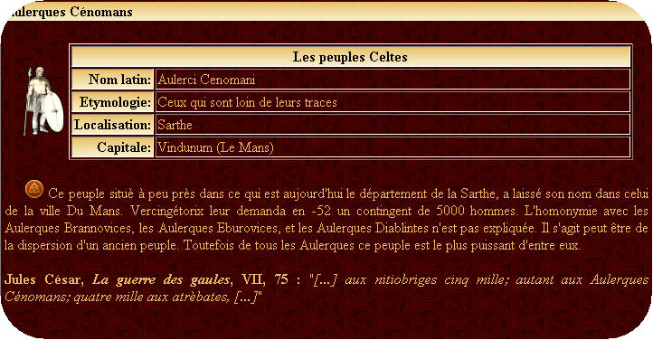 Salut Matrix, Je te fais remarquer que les Cénomans d'Italie du Nord, n'ont jamais été qualifiés d'Aulerques, contrairement à ce que tu annonces dans l'un de tes messages @+Pierre Pierre Crombet