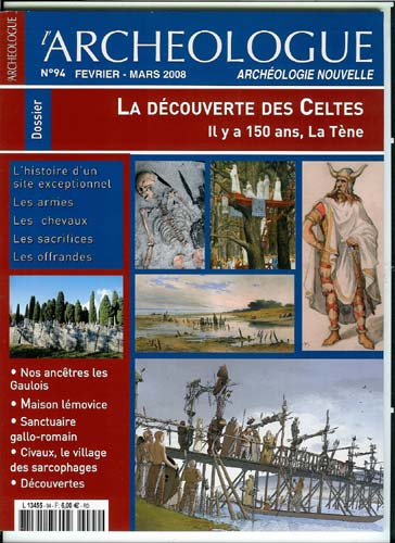 Le dossier sur La Tène est copieux et agréable, avec beaucoup d'illustrations sur la découverte du site, les armes, les chevaux, le pont, les sacrifices... Il y aussi un article intéressant de Jean-Louis Brunaux, "Avant qu'le ciel nous tomb' sur la tête" traitant du thème de la fin du monde, l'eschatologie, chez les Gaulois, extrait de "Nos ancêtres les Gaulois". Jean-Paul Brethenoux. Sedullos Lemouico immi exobnos in catue ! ΣΕΔΟΥΛΛΟΣ (Graecum est, non legitur !)