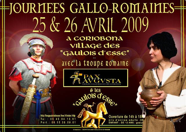 Programme des Journées gallo-romaines des 25 et 26 avril 2009 à Esse (16500) Entrée 5 € ; gratuit pour les enfants de moins de 12 ans Samedi 25 avril 2009 14h : ouverture du site. Artisanat, archéologie expérimentale ; vie quotidienne des Romains et des Gaulois ; combats de gladiateurs et danses romaines ; manœuvres romaines, attaque du camp romain par les Gaulois 17h : attaque du village gaulois par les Romains et les Germains 18h : fermeture du site au public. Dimanche 26 avril 2009 14h : ouverture du site. Artisanat, archéologie expérimentale ; vie quotidienne des Romains et des Gaulois ; combats de gladiateurs et danses romaines ; manœuvres romaines, attaque du camp romain par les Gaulois 17h : attaque du village gaulois par les Romains et les Germains 18h : fermeture du site au public http://lesgauloisdesse.free.fr/ http://www.paxaugusta.net/ Jean-Paul Brethenoux. Sedullos Lemouico immi exobnos in catue ! ΣΕΔΟΥΛΛΟΣ (Graecum est, non legitur !)