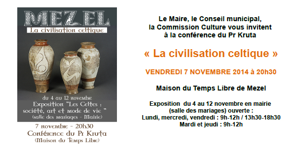 Pour ceux ou celles qui se trouveraient en territoire arverne, dans le cadre d'une exposition sur "la civilisation celtique", Vencesla Kruta viendra faire une conférence demain vendredi 7 novembre à 20h30 à Mezel (63) au pied du Puy de Mur.