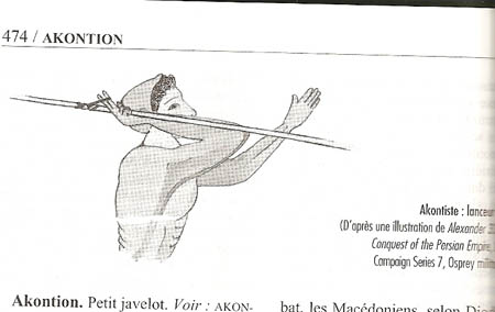 Je remets le dessin d'un akontiste grec, lanceur de javelots utilisant une courroie de projection (amentum en latin).