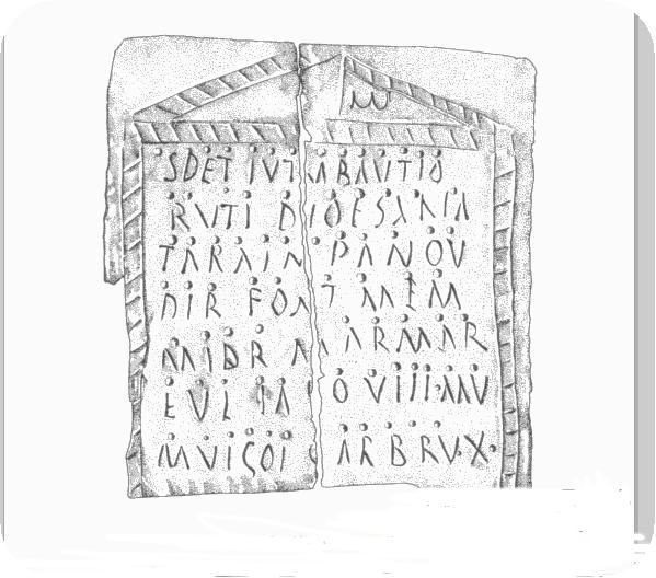 ...A la déclinaison consenantique appartien Carbrux (Baudecet) nom présumé du dédicant au nominatif (-s, cf rix roi), sans doute Caro-mog-s = à qui son pays est cher. Ruti serait un datif en i accordé avec iutrabaution (au dieu Rutis, forme abrégé de Rudiobus, désinence qui se distingue du Gaulois Ucuete = au dieu Ucuetis)