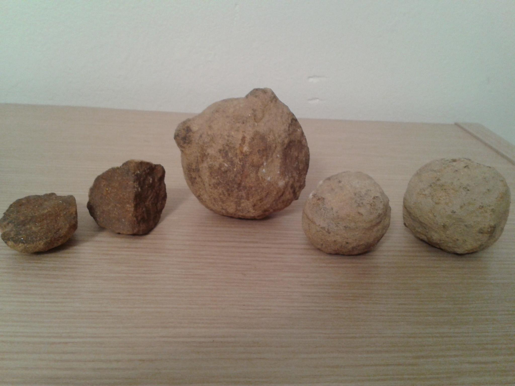 Il y a quelques années en me promenant dans un champs sur la commune de Pourrières (var), j'ai trouvé ces sortes de pierres (j'en ai même cassé une), pierres qui semblent finalement être des boulets de fronde romains (Marius et les teutons ?).